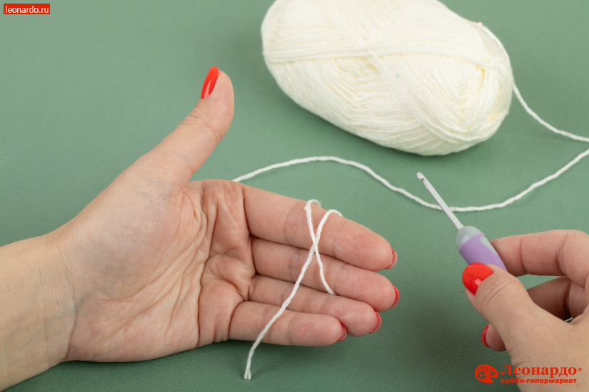 1. В начале вязания делаем кольцо амигуруми. Сначала обвиваем рабочую нить вокруг пальцев.