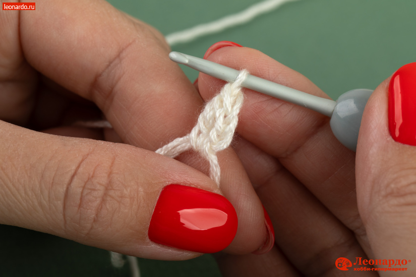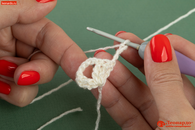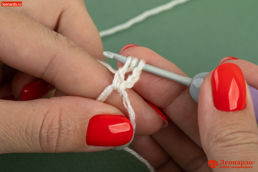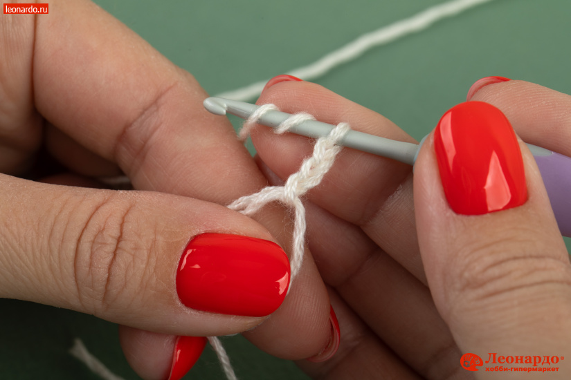 2. Вводим крючок под петлю, захватываем и вытягиваем крючком рабочую нить.