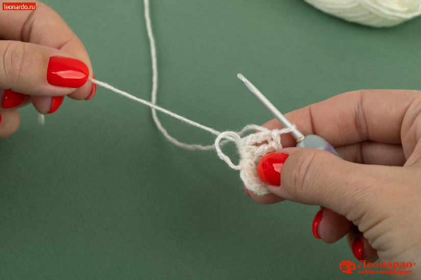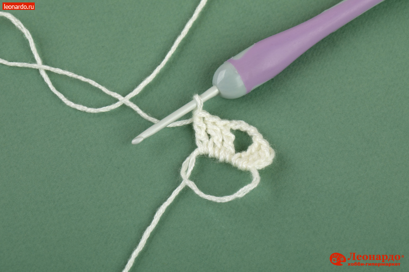7. Рядом провязываем еще один столбик с 2 накидами и снова набираем 4 воздушные петли.