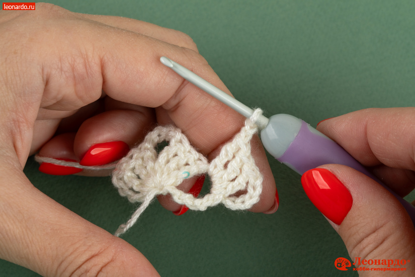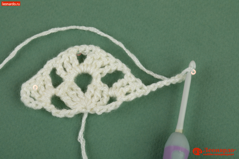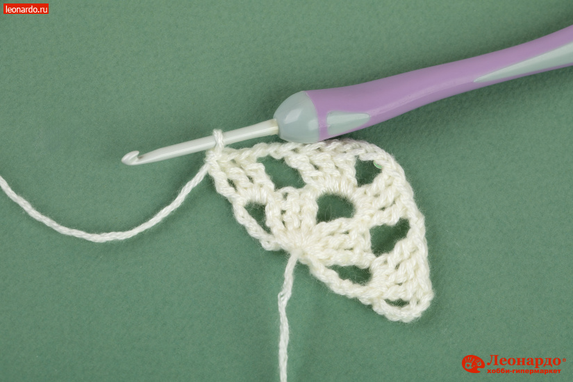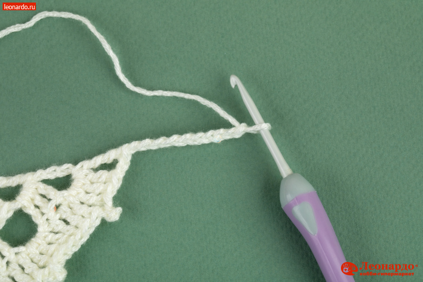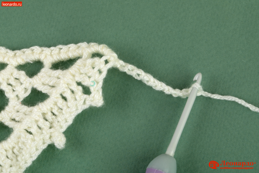 В середине ряда провязываем в цепочку из воздушных петель предыдущего ряда 3 столбика с 2 накидами, 3 воздушные петли (последнюю провязываем петлю в первую петлю соединительным столбиком), затем снова 3 столбика с 2 накидами.