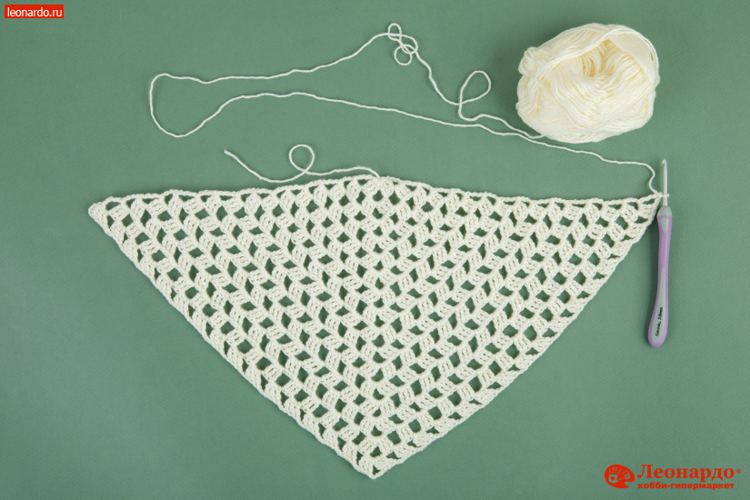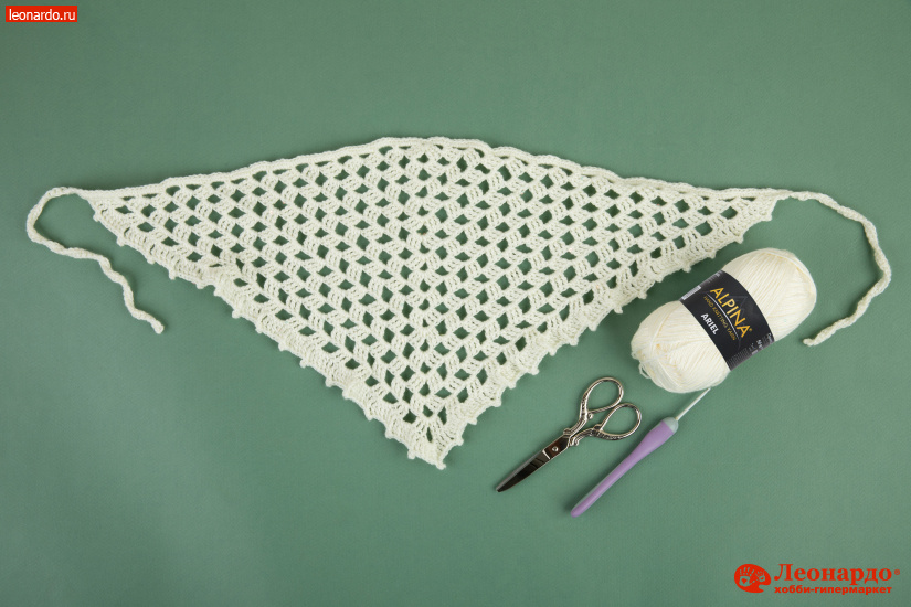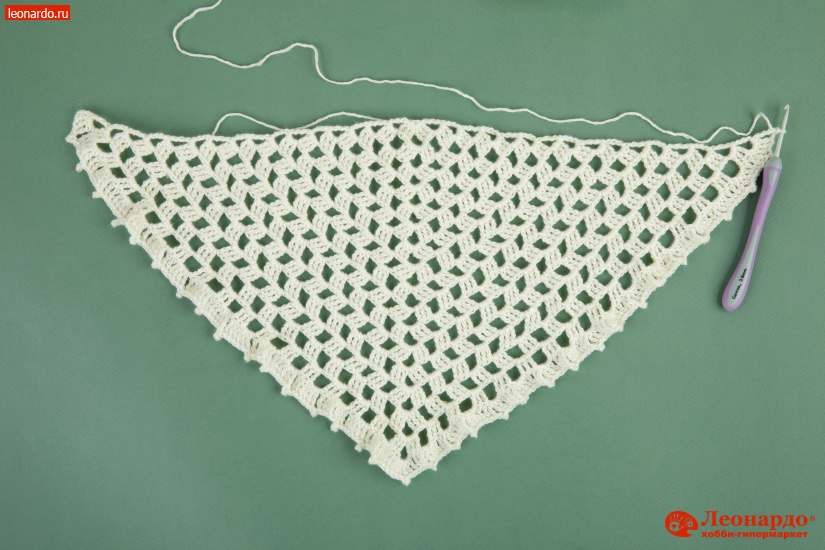 21. Дойдя до внешнего угла косынки, нить с небольшим запасом обрезаем. Конец аккуратно прячем за ножки столбиков обвязки.