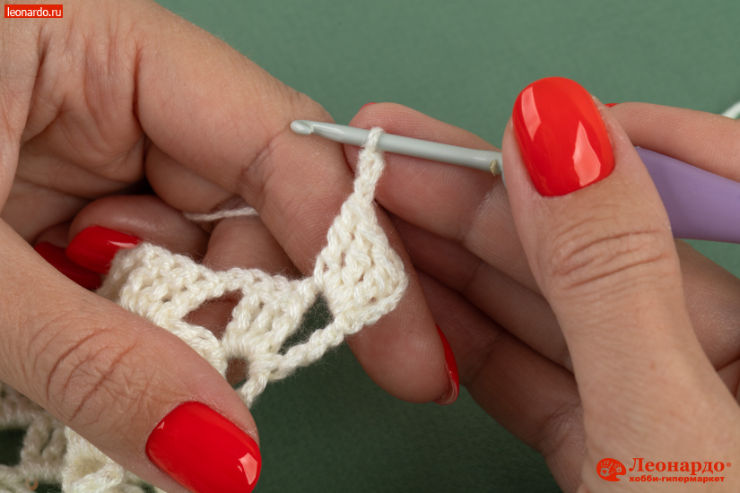 12. Снова набираем 2 воздушные петли и далее 3 столбика с 2 накидами, 2 воздушные петли и один столбик с 3 накидами в последнюю цепочку из воздушных петель предыдущего ряда.