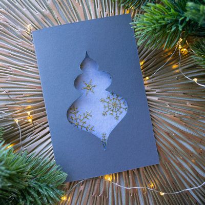 Делаем простую открытку с новогодним шаром из блестящих бусин и алой ленты.