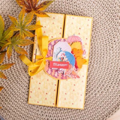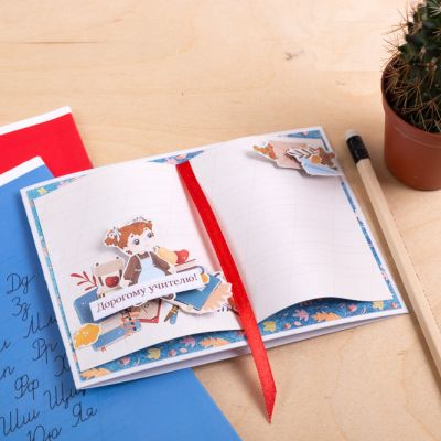 Делаем объемную открытку в виде портфеля с поздравительной надписью.