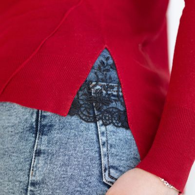Обновляем джемпер с помощью гипюровой ленты контрастного цвета.