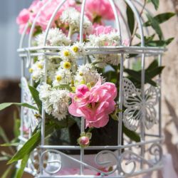 Яркий цветочный букет, задекорированный при помощи различных флористичеких элементов.