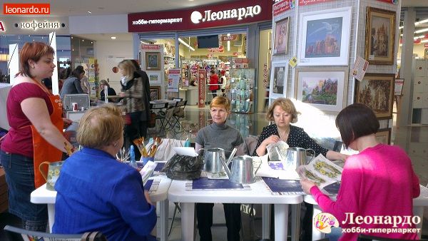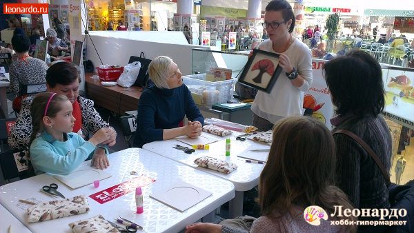 А завтра вас ждёт: картина «Прекрасная Дама» («пэчворк биз иглы»), шарф-жабо «Воздушный» (вязание на спицах), картина «Совушка» (витражная роспись), настенный органайзер «Весенний» (скрапбукинг), колье из цветов в технике мокрое валяние и многое другое!